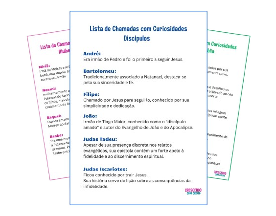 16 cartelas exclusivas (4 por tema) Fichas de chamada com curiosidades bíblicas Entrega imediata por e-mail Uso vitalício e ilimitado Material pronto para imprimir
